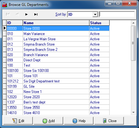 Use the Browse GL Departments window to locate existing or to add GL Departments. Sort the Browse GL Departments screen or select to create a new GL Department account. Select the button to edit or review an existing account or double click to open.