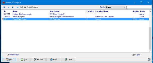 Use the Browse PC Projects window to locate existing or to add PC Projects. Sort the Browse PC Projectssor select to create a new Project Costing Project account. Select the