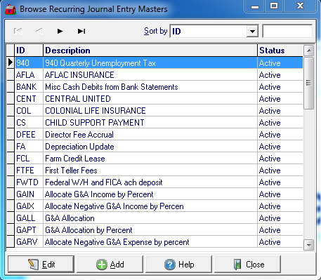 Use the Browse Recurring JE Masters window to locate existing or to add Recurring Journal Entry Master. Sort the Browse Recurring JE Masters screen or select to create a new Recurring JE Masters account. Select the button to edit or review an existing Recurring JE Masters or double click to open.
