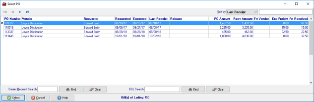 The BOL Search, Bill of Lading Search, is available to search for a purchase order by the bill of lading entering during the receipt process.