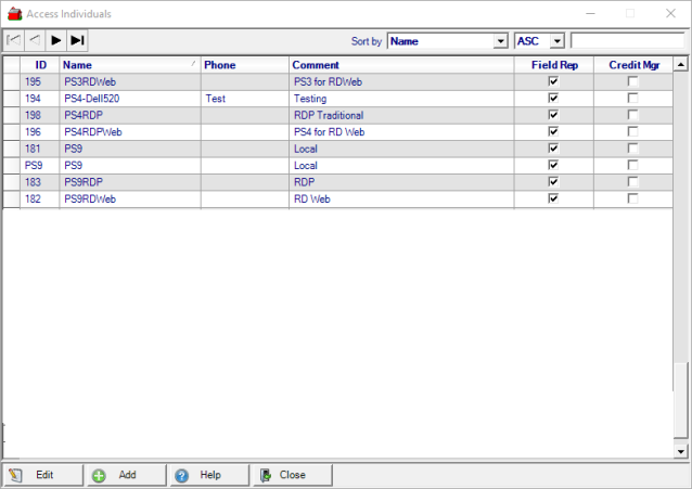 View the list of existing Individuals. Use the Add button to create a new Individual or click on an Individual and the Edit button to modify an existing account.