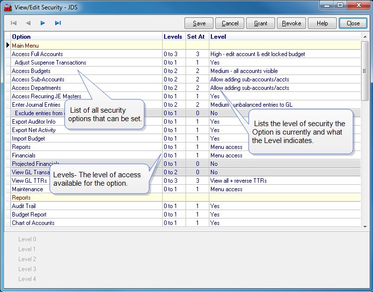 to view the menus associated with the selected Module to grant, edit or revoke access. See Security Overview for more information.