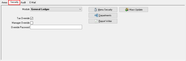Use the Security tab to grant, edit and revoke security to modules, menus, sub-menus, departments and Report Writer. Select this option to perform Mass Updates to security settings.