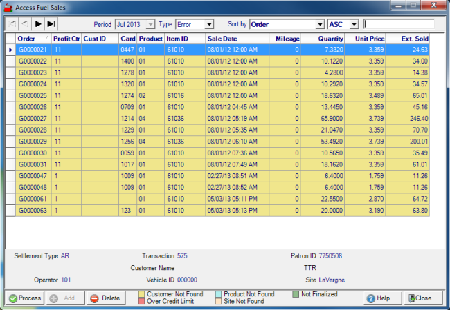 Fuel Sales may be rejected due to a number of errors. If the customer account is not found, is over the credit limit, if there is an error in the product code or if the Site is not set properly on the Location. Transactions that fit any of these rejection reasons will be listed within the Access Fuel Sales window when the Type is changed to Error.