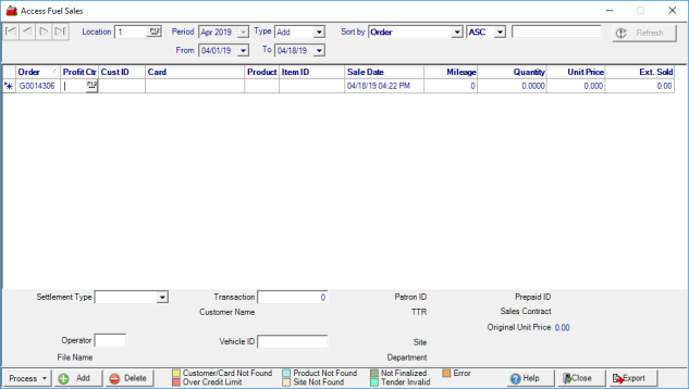 Fuel Sales can manually be entered if necessary by selecting Add at the bottom of the Access Fuel Sales window.
