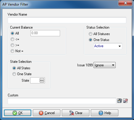 Custom - This is an advanced search function using Condition Builder and is available by clicking the toolbox icon. Select the field names to search, specify an operator or comparison, then a field or value and a second field or value if applicable. Select an option in the Combining with Existing Condition if applicable. When the search condition is built, select okay which enters the condition in the Custom search field. Select Okay to search all AP Vendors with this condition.