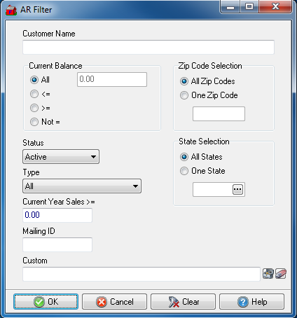 Use an Accounts Receivable Filter to limit or focus on specific Customer accounts. This filter is available in the AR menu, Documents, and Mail Merge.