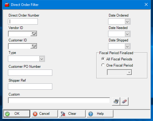 Add a Direct Order Filter when searching for an Open or Closed Direct Order by entering information in one or multiple fields.