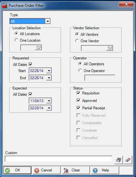 Use a Purchase Order Filter to isolate a specific purchase order by entering additional criteria then select OK to activate. Enter values in one or multiple fields to focus on the items needed.