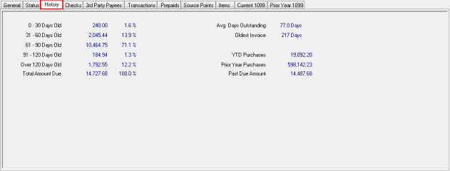 View historical information on an account including the current outstanding balance in Aging brackets, number of days between invoice dates and payment dates and YTD purchase information.