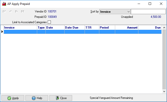 Select the Apply button and the Apply Prepaid window appears with a list of all unpaid invoices for the vendor. When the checkbox Limit to Associated Categories is selected, only the invoices with approved Item Categories for the Prepaid are listed. This option prevents the Prepaid being used to settle transactions with items outside approved Item Categories. Be aware that all Items on the invoice must be in an approved Item Category to apply the Prepaid.