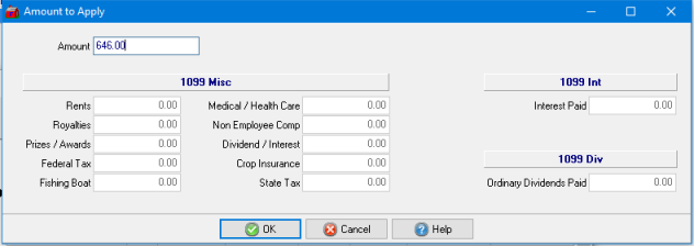 When the Amount to Apply window opens, the total amount to be paid will be in the Amount field. Retain or edit this amount and indicate any applicable amounts in the 1099 fields and select OK. The invoice amount reduces the balance of the AP Vendor Prepaid.