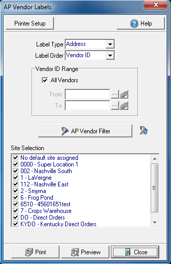 Create Vendor Labels for mailings or file folders for all vendors, a range of vendors or set a Vendor filter.
