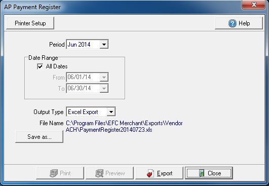 Create a file to export of AP Vendor payments for a selected Financial Period.