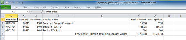 A count of the number of payments made and totals the Check Amount and Amount Applied columns appears at the bottom of the report.