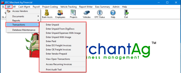 Transactions can be entered into Merchant Ag FIN through multiple menu options. Learn more about each menu item by clicking on the title.