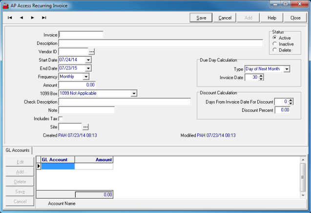 Select Add from the AP Browse Recurring Invoices to create a new Recurring Invoice. In the blank Access Recurring Invoice window, reference the AP Vendor account, select a Start and End Date, and Frequency of the invoice will be created. Look for