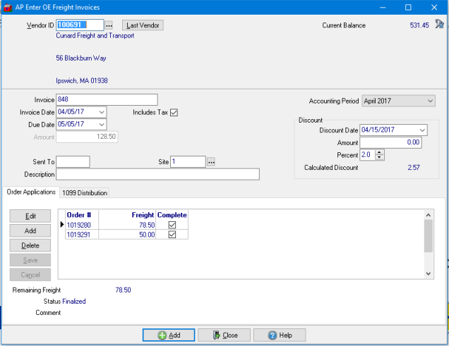 - Remaining Freight- The difference of freight indicated on the Order and entered in the Applied Freight field.