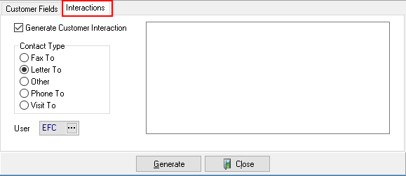 Select Generate Customer Interaction to update the Customer account with the Contact Type selected.