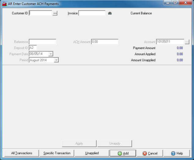 Enter Customer Payments made by ACH and apply to outstanding invoices.
