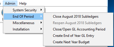 Select the End of Period Menu if the current Period needs to be manually closed, created the End of Year GL entry and set Budgets.
