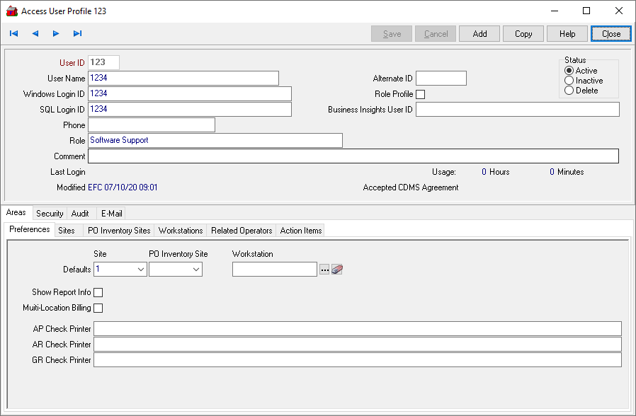 - Menu Security- View the changes to a user account created with the Set Security by Menu option.