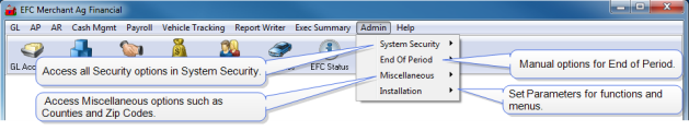 Utilize the Admin Menu to set security and parameters for the menu options and functions available in Merchant Ag PM and FIN.