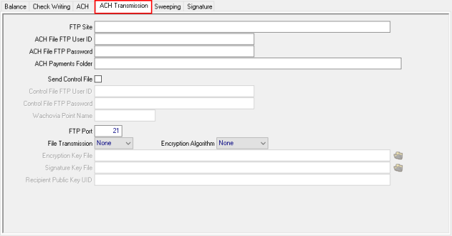ACH Payments Folder- Utilize this field to utilize any SFTP information for the Bank account. When this field is left blank, the file will be transmitted using FTP.