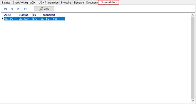The Reconciliation tab will provide the date used in As Of and Starting, By will provide the User ID of who performed the reconciliation and the date and time when the account was Reconcilied. Click on a selected entry and the View button for a PDF version of the reconciliation. Learn how to reconcile a bank account here.