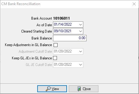 The Reconciliation tab will provide the date used in As Of and Cleared Starting Date, Provide the User ID of who performed the reconciliation and the date and time when the account was Reconciled. Use the new Reconciliation tab in the bank account and click on a selected entry then the View button for a PDF version of the reconciliation.