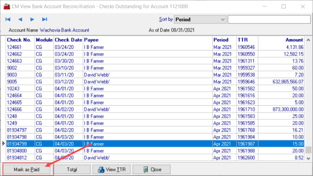 From the grid, highlight one or multiple checks and then click Mark As Paid. Select a number of checks and use the Total button to see the sub-total. Close the window when finished.