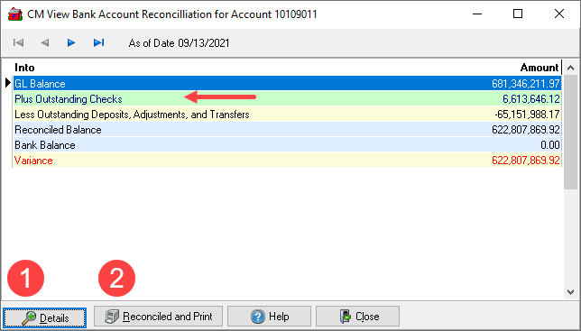 To mark an Outstanding Check as Paid, select Plus Outstanding Checks and click the Details button, see number 1.