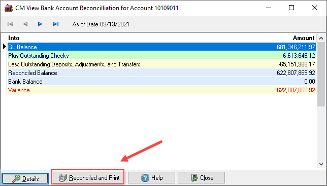 When reconciled, click Reconciled and Print