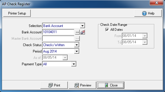 Print the Accounts Payable Check register for a selected Bank account, Financial period and date range.