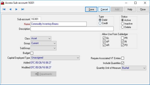 For Commodities & Grain Merchandising sub-accounts, select Include Quantities and choose a Quantity Unit of Measure if the Enable GL Quantities parameter is selected. The UOM selected should match the UOM in the Item Category in Merchant Ag PM if the sub-account will be referenced on the GL tab.