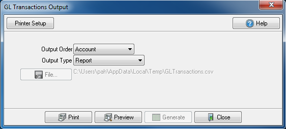 Select Output to create a Report, CSV file or Excel spreadsheet of selected GL Transactions.