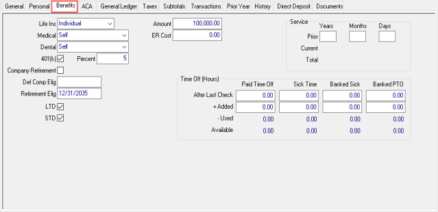 Track Benefit information for an employee regarding Insurance, Retirement Plans and Paid Time Off.