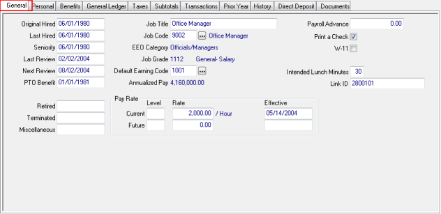 Use the General tab to include basic information about the employee such as Hire dates and Pay Rates. When creating a new employee account, fields marked with indicate a required field.