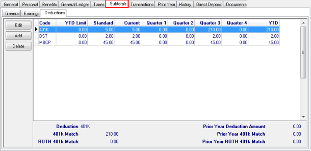 A subtotal of Deductions by Deduction Code and totaled by Quarter and Year To Date.