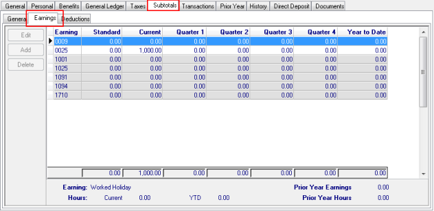 View the current yearly Subtotals for an Employee, for W2s, Earnings and Deductions.