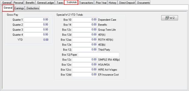 Year to Date Deduction totals are tracked in Special W-2 YTD Totals. Each field is prefaced with which box on the W2 the total will populate.