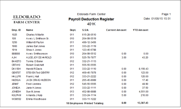 Create a Deduction Register for an individual Deduction Code listing the Employees and their current and Year To Date amounts.