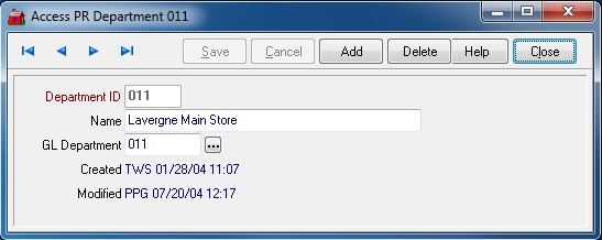 View, Edit and Add Departments which will be used as a method of grouping Employees together and are added through Access Employees. Select Browse PR Department Codes to view a listing of all Department Codes in the Browse PR Department Code window. Select Add to create a new Department.