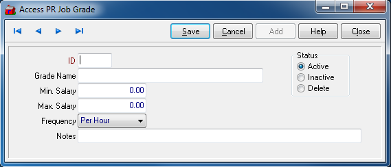 Create, View or Edit a Job Grade that indicates the minimum and maximum salary level for a job. Vew a listing of all Payroll Job Grades in the Browse Payroll Job Grades window. Select a Job Grade by double clicking on the name or click once and select the Edit button. New Bank Accounts can be created with the Add button.
