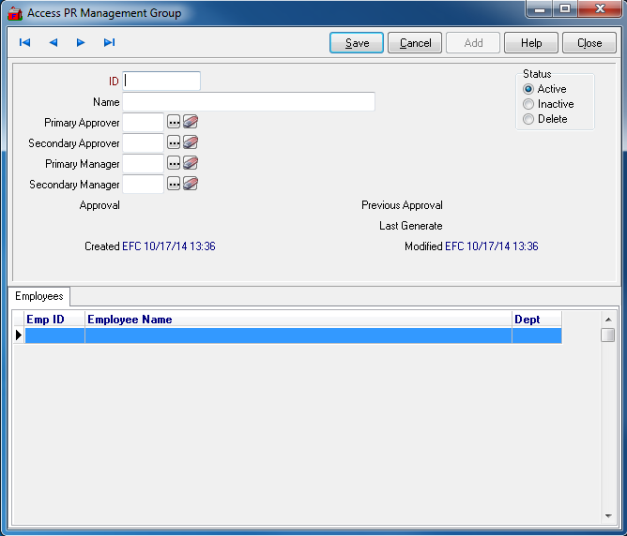 Create Management groups which sets who will have the ability to approve employees hours. This option is active if using Chronologer. Select Browse PR Management Groups to view a listing of all Management Groups in the Browse PR Management Groups window. Select a Management Group by double clicking on the name or click once and select the Edit button. Select Select the Add button to create a new Management Group.