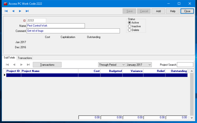 Create Work Codes, also known as Categories, to assign to Projects to accumulate totals of Cost, Budgeted Amounts, Variance, Relief and the amount of Outstanding Transactions for the Category. The title of this menu is defined in Admin > Installation > Access Parameters > PC. Access Browse PC Work Codes to view the list of existing Work Codes.