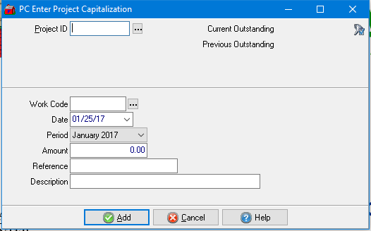 Use Project Capitalization, a method of recording cost as an asset rather than an expense, to enter cost for one Work Code, also known as Category, at a time. This approach is used when a cost is not expected to be entirely consumed in the current period, but rather over an extended period of time.
