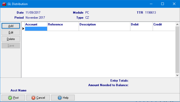 Enter the General Ledger accounts required for capitalizing the Cost and click Post. See GL Distribution for more information on this function.