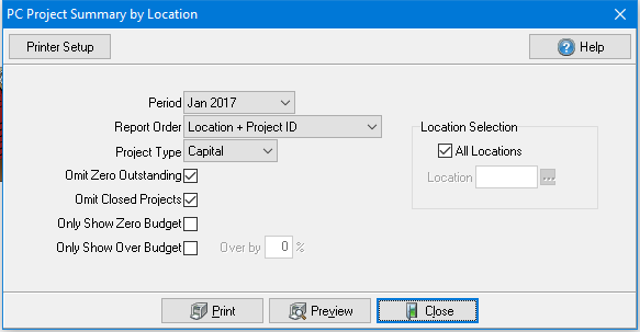 Create a report containing Summary information about Project Costing Projects for all or one Location.