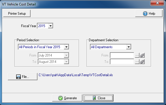 Create a spreadsheet with Vehicle Cost Detail for selected Financial Periods and Departments.